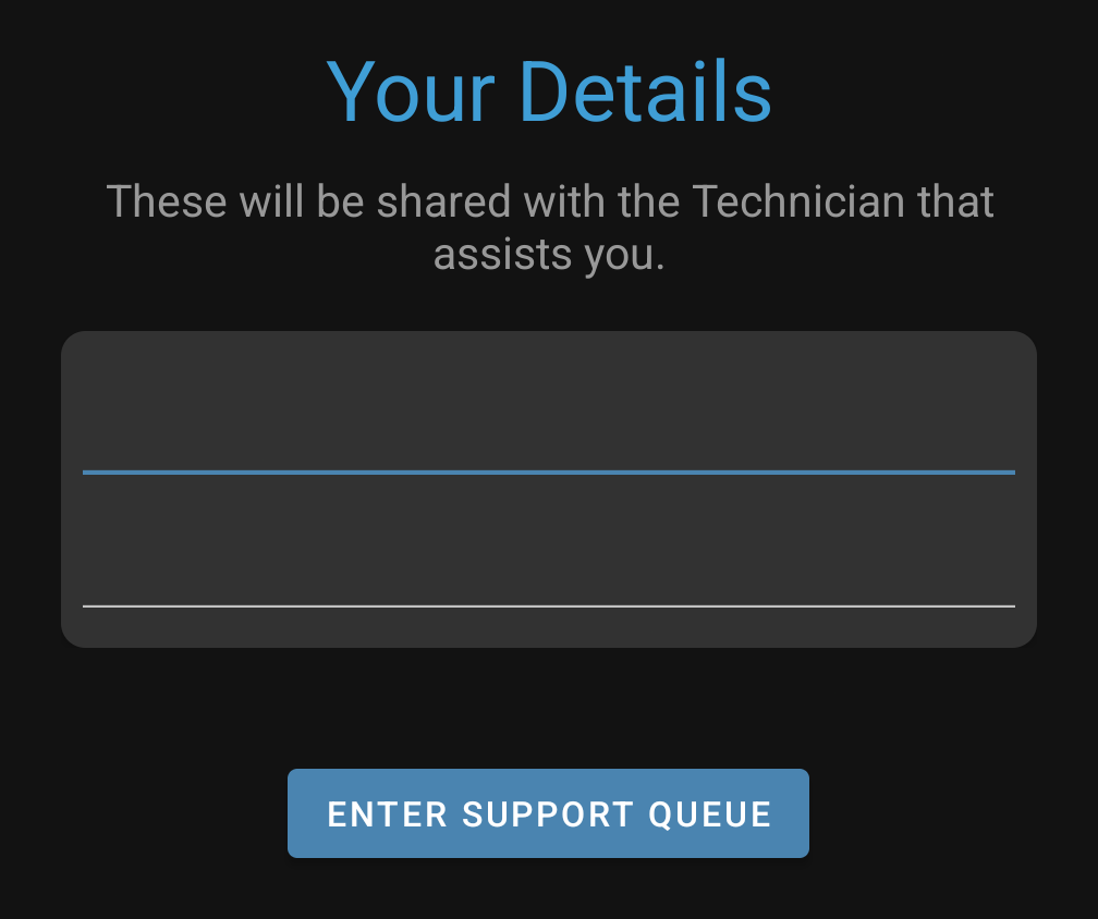 When prompted, enter your name and company (any details are fine), then tap Enter Support Queue.